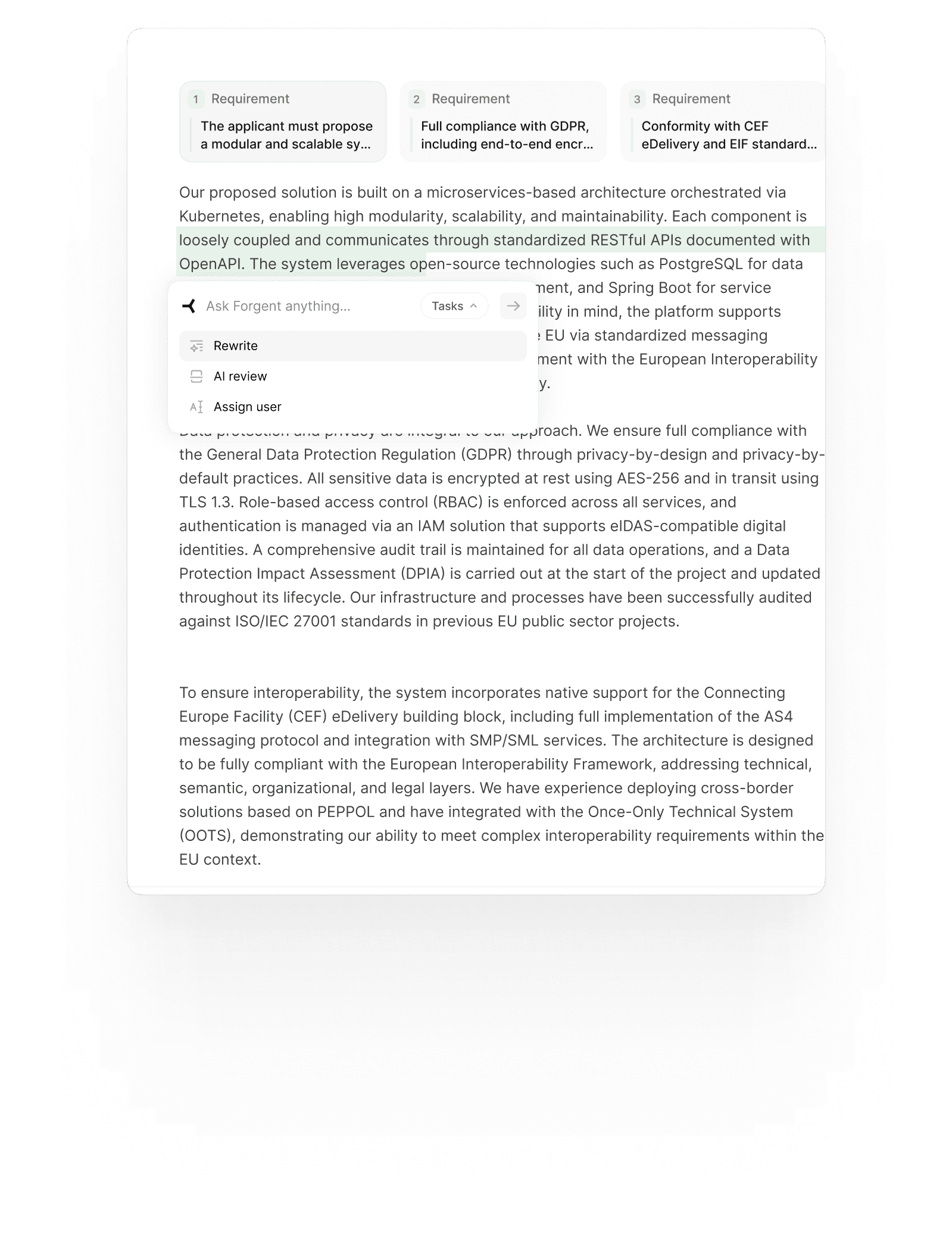 Draft winning and compliant proposals. Forgent transforms your institutional knowledge into tailored responses and verifies content to ensure accuracy and full compliance — resulting in high-converting submissions.
