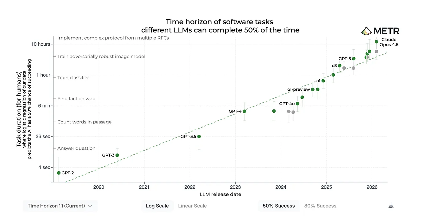 Around January 2026, coding agents crossed a coherence threshold. The models didn't just get faster at autocomplete. They became capable of sustained, multi step reasoning: planning an implementation, executing it across files, running tests, diagnosing failures, and iterating autonomously until tests pass. This is an exponential trend visible in the METR benchmarks and others.