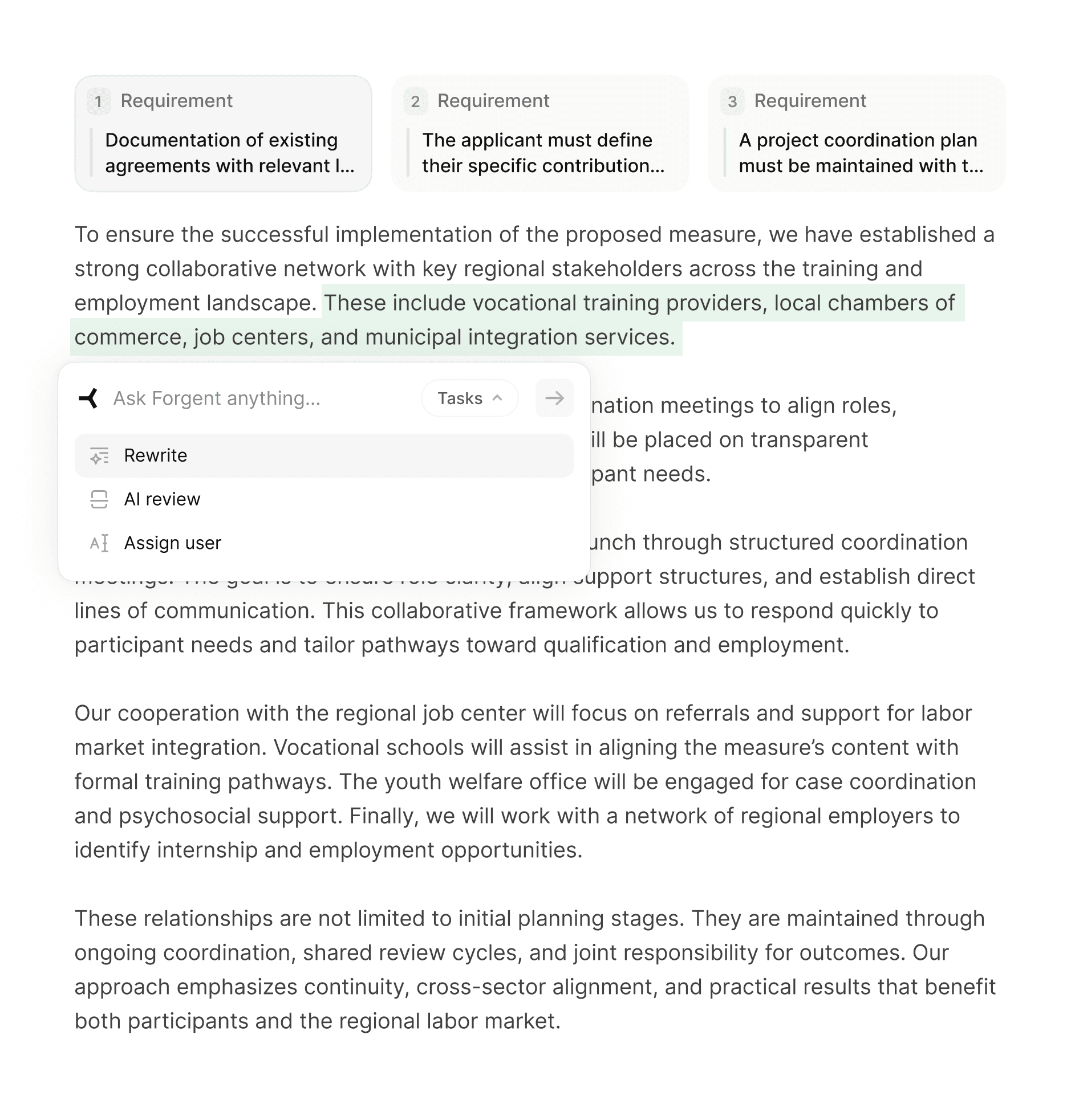 Reichen Sie mühelos fehlerfreie Angebote ein. KI stellt sicher, dass jede Bewerbung die Vorschriften erfüllt, ohne Ausnahmen.